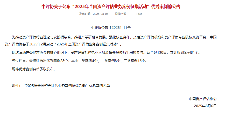 中国资产评估协会(中评协)于2025年8月8日发布《中评协公告〔2025〕11号》,正式公布"2025年全国资产评估业务案例征集活动"评选结果。由中瑞世联资产评估集团与安徽财经大学周蕾、张春强老师联合申报的《ESG信息披露驱动下企业无形资产价值重构与评估机制研究》案例,经严格评审,成功入选全国优秀案例名单,荣获"三类优秀案例"。