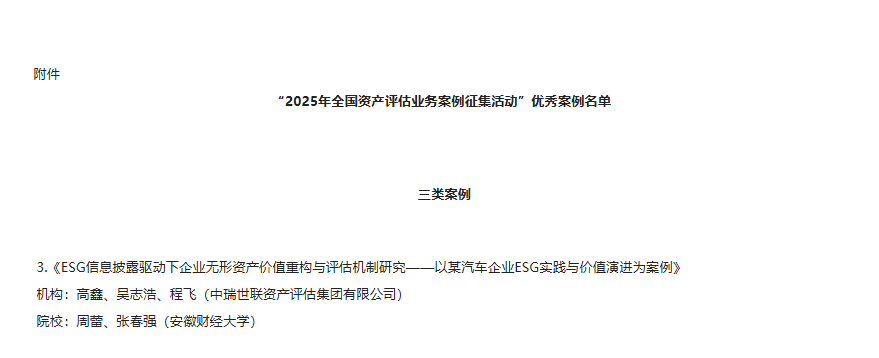 中国资产评估协会(中评协)于2025年8月8日发布《中评协公告〔2025〕11号》,正式公布"2025年全国资产评估业务案例征集活动"评选结果。由中瑞世联资产评估集团与安徽财经大学周蕾、张春强老师联合申报的《ESG信息披露驱动下企业无形资产价值重构与评估机制研究》案例,经严格评审,成功入选全国优秀案例名单,荣获"三类优秀案例"。